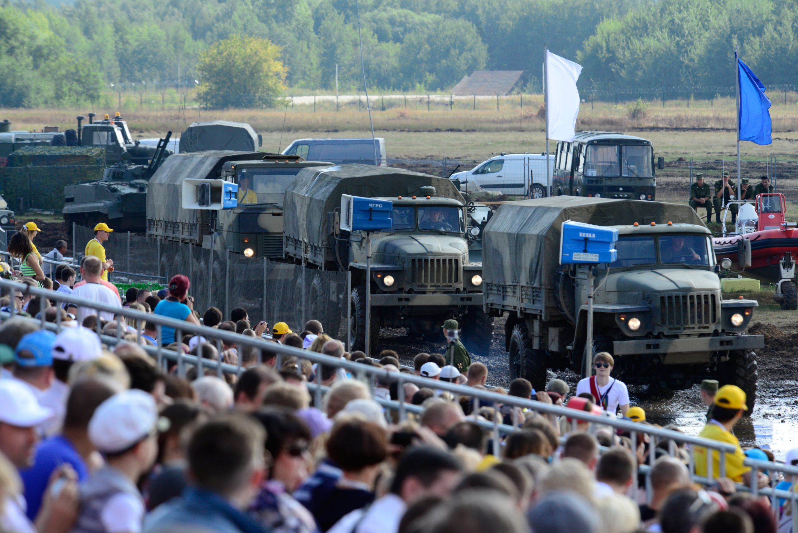 Для демонстрации возможностей “наземной” техники, как колёсной, так и гусеничной, на площадке ТВК “Россия” была создана уникальная пробеговая трасса, рядом с которой расположились зрительские трибуны. Таким образом, впервые в нашей стране была создана инфраструктура, позволяющая в одном месте осмотреть выставочные павильоны, и тут же познакомиться с натурными образцами техники как на статике, так и в динамике. А лётная программа дополняла возможности по показу передовых образцов авиатехники.